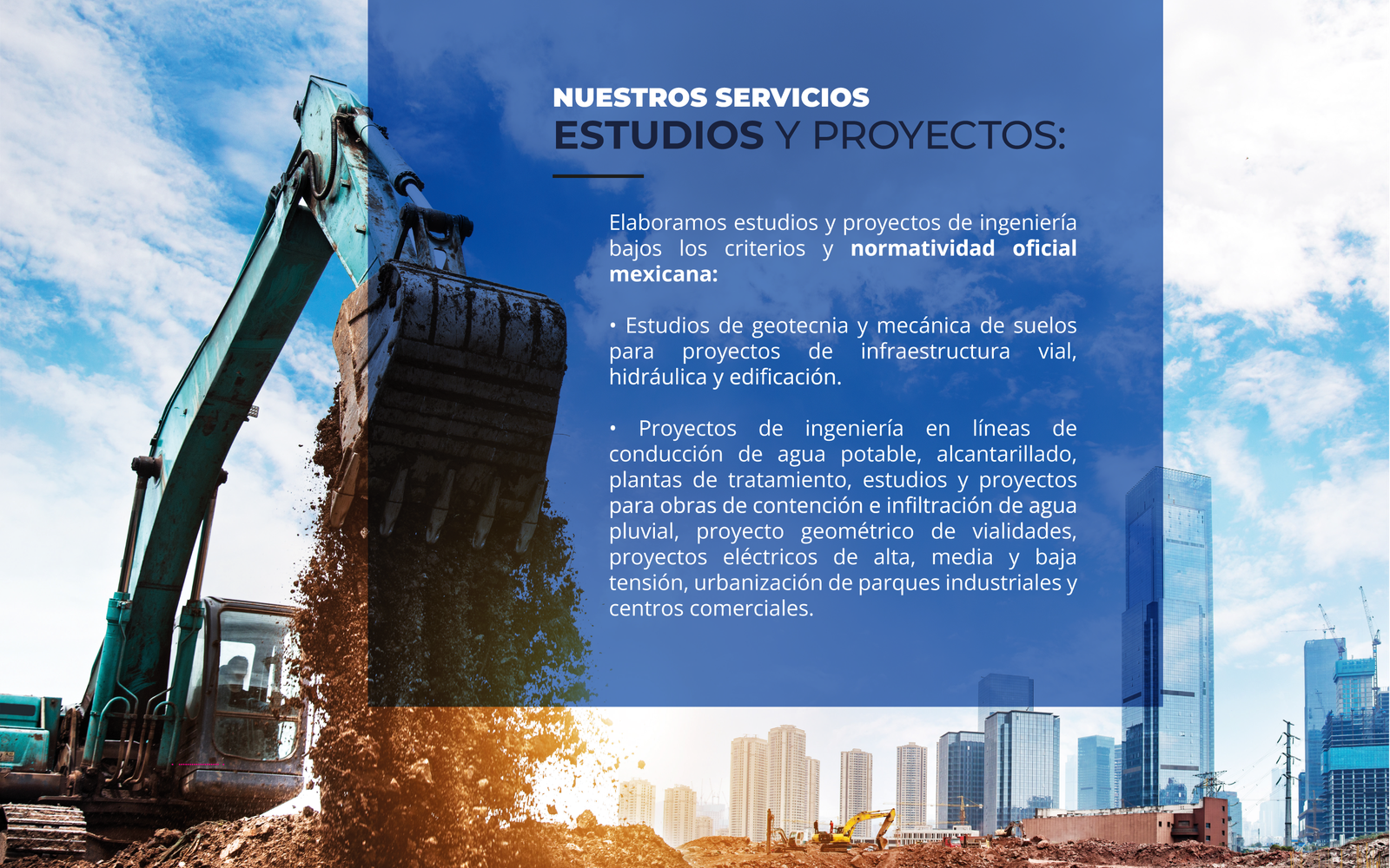 Somos una empresa comprometida con la excelencia en la elaboración de proyectos de ingeniería, dirección y supervisión de obra, así como en la gestoría y consultoría técnica especializada.